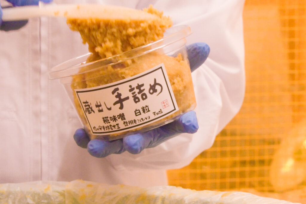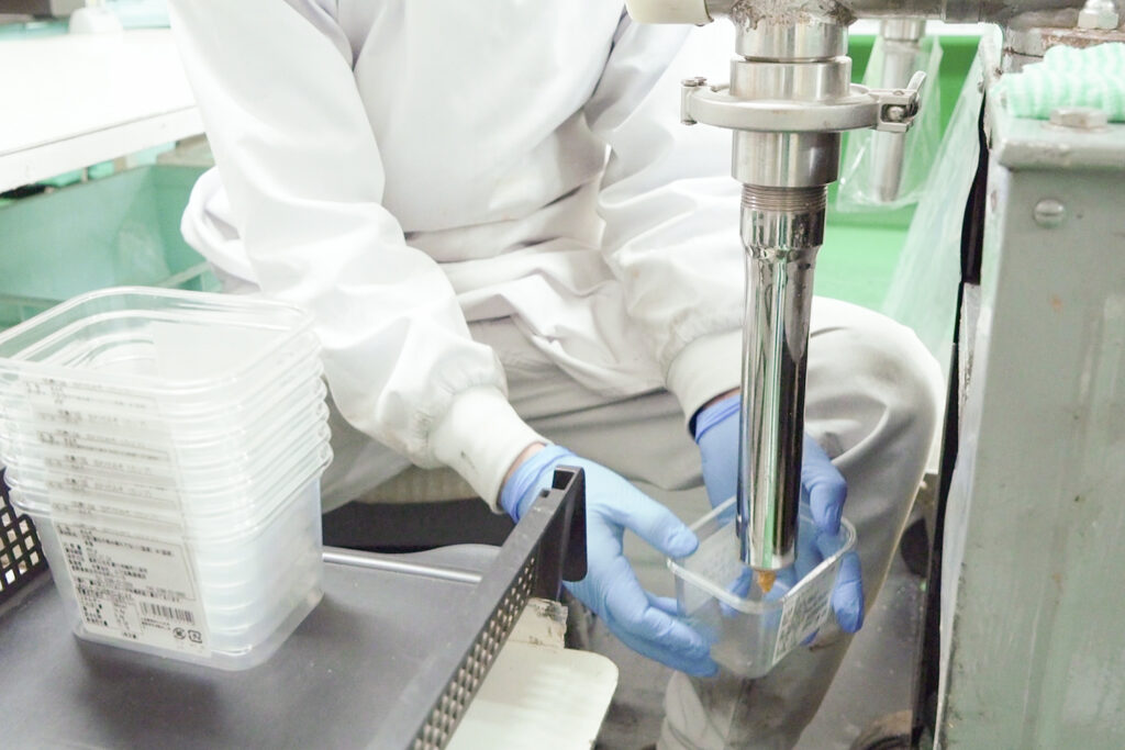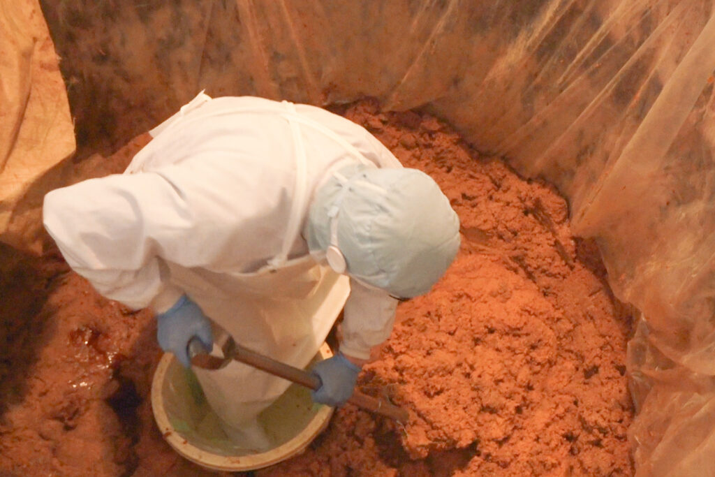掘り出した味噌は、さらに一つ一つ手作業で容器へ詰めます。充填機を使わないため、味噌はこねられず、熱のダメージを受けません。粒感が残り、香りが生きている「蔵出しそのまま」の味わいが保たれます。