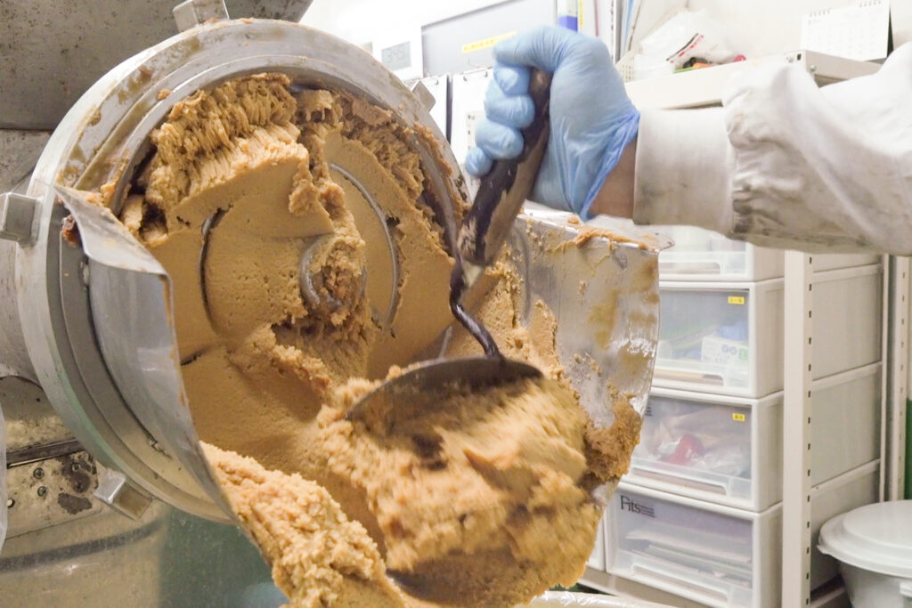 山万味噌では、これらの機械工程を極力使わず、木桶や仕込み容器から味噌を手作業で掘り出す「手堀り」を採用しています。スコップを使い、ゆっくりと丁寧に味噌をすくい取るため、味噌はこねられず熱も帯びません。糀や大豆の粒がそのまま残り、蔵で熟成された自然な香りと風味も損ないません。